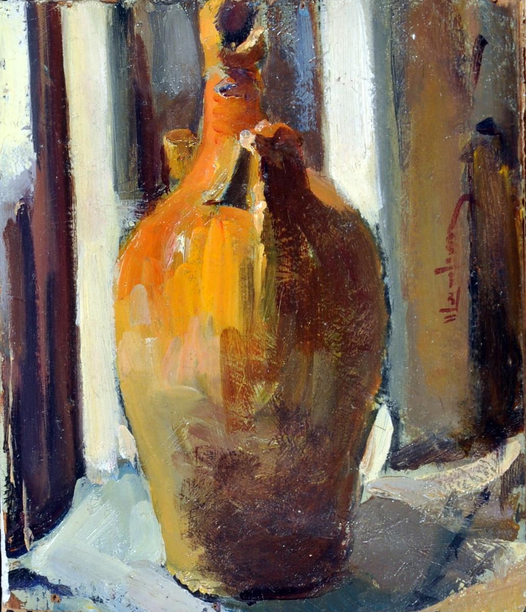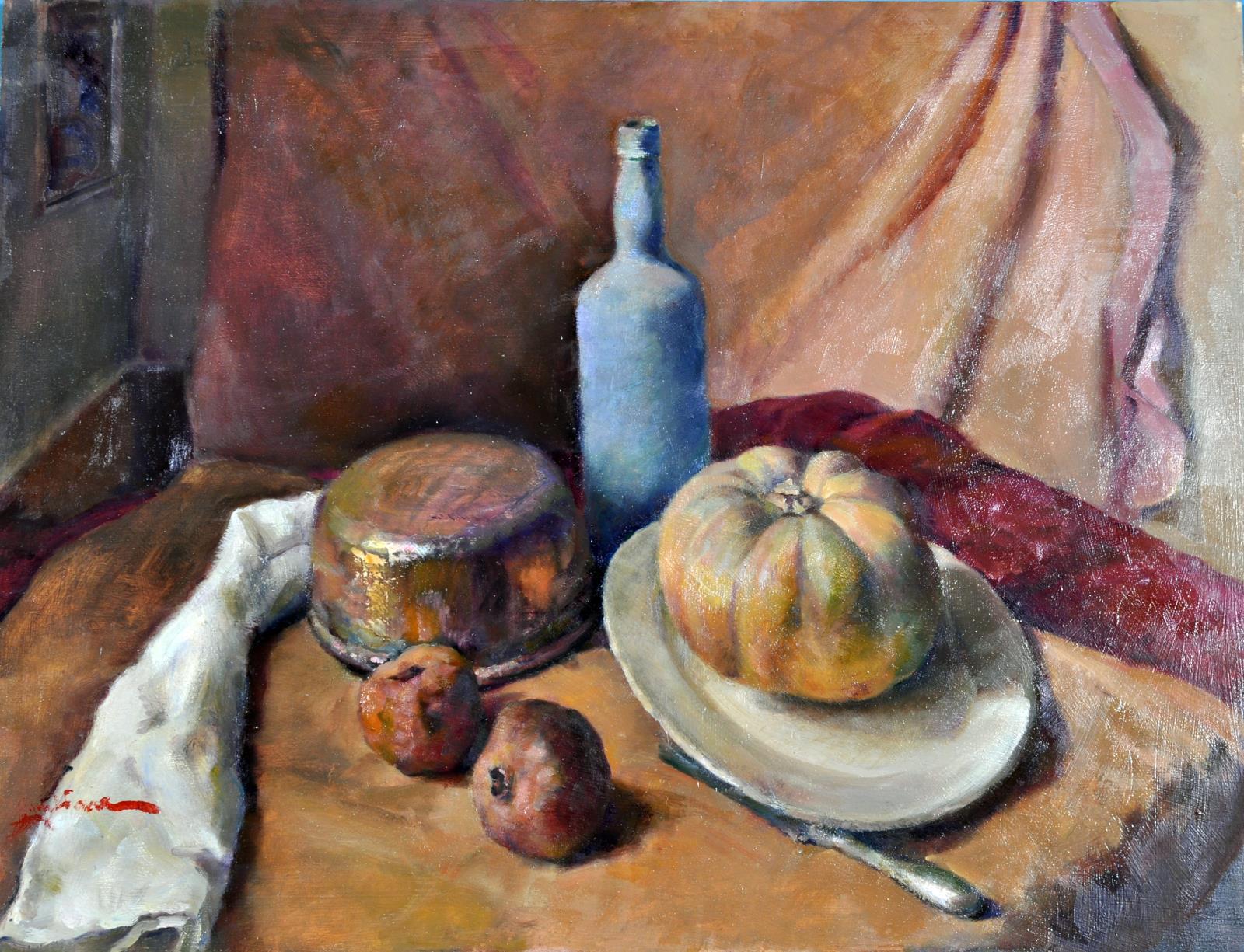 Lambiase WalterLambiase Walter (Cava dei Tirreni, SA 1925 - Napoli 2004) Natura morta con pentola di rame olio su tavola, cm 55x71 firmato in basso a sinistra: Lambiase a tergo timbro e firma dell'artista