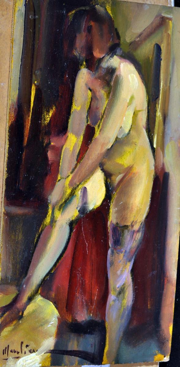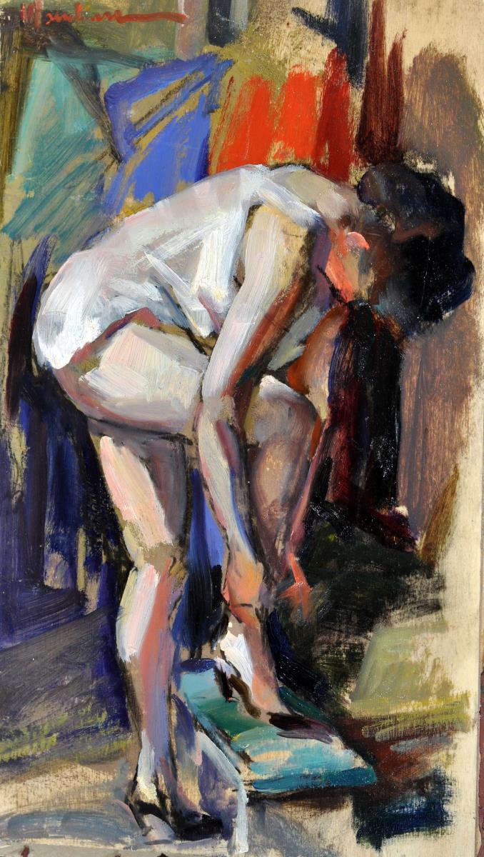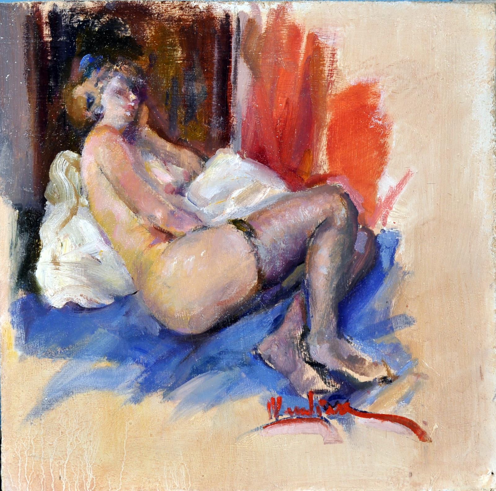 Lambiase WalterLambiase Walter (Cava dei Tirreni, SA 1925 - Napoli 2004) Nudo disteso olio su masonite, cm 28,5x29,5 firmato in basso a destra: W. Lambiase a tergo firma e timbro dell'artista