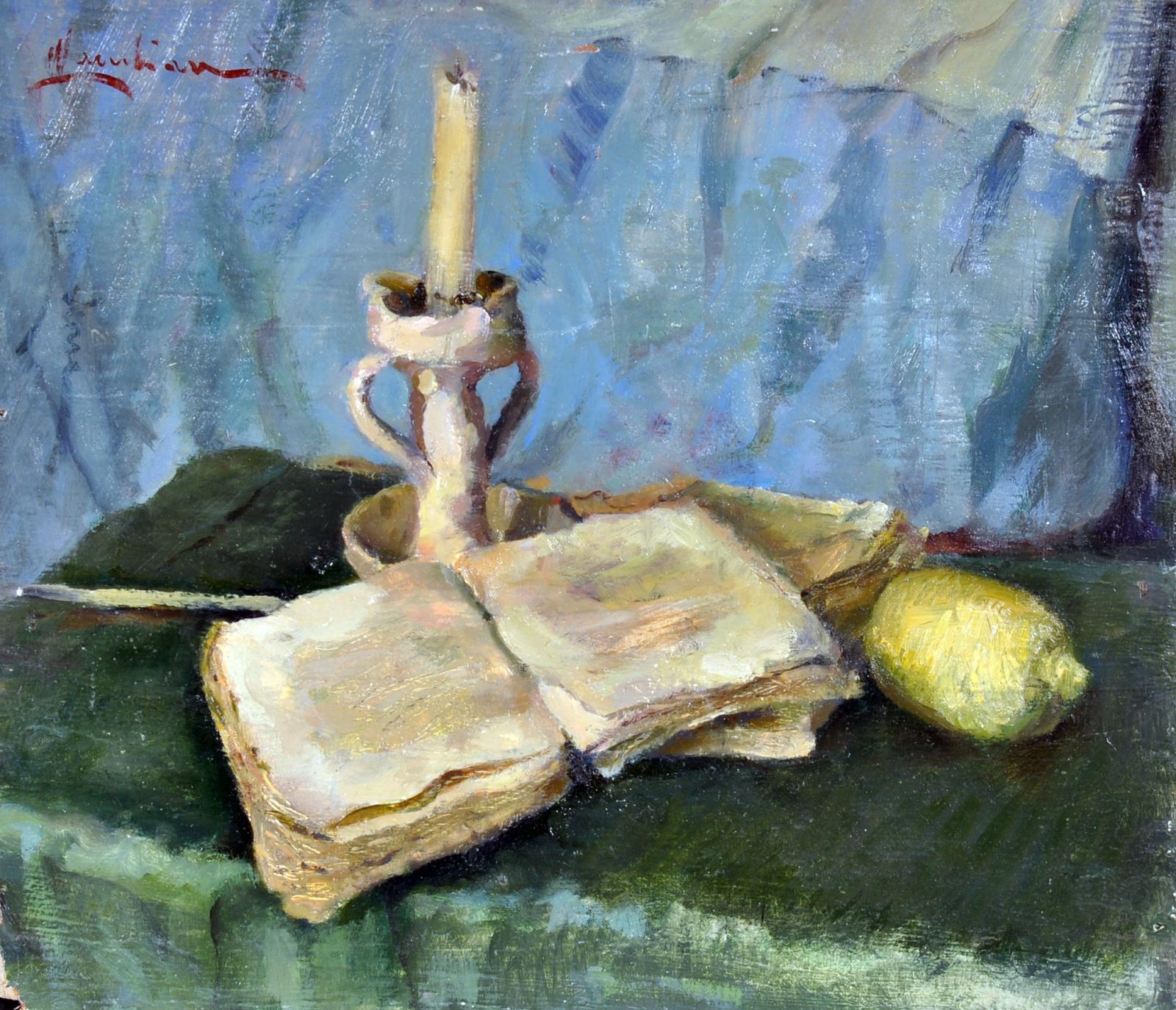 Lambiase WalterLambiase Walter (Cava dei Tirreni, SA 1925 - Napoli 2004) Natura morta di libri e limoni olio su tavola, cm 50x60 firmato in basso a sinistra: W. Lambiase a tergo firma e timbro dell'artista