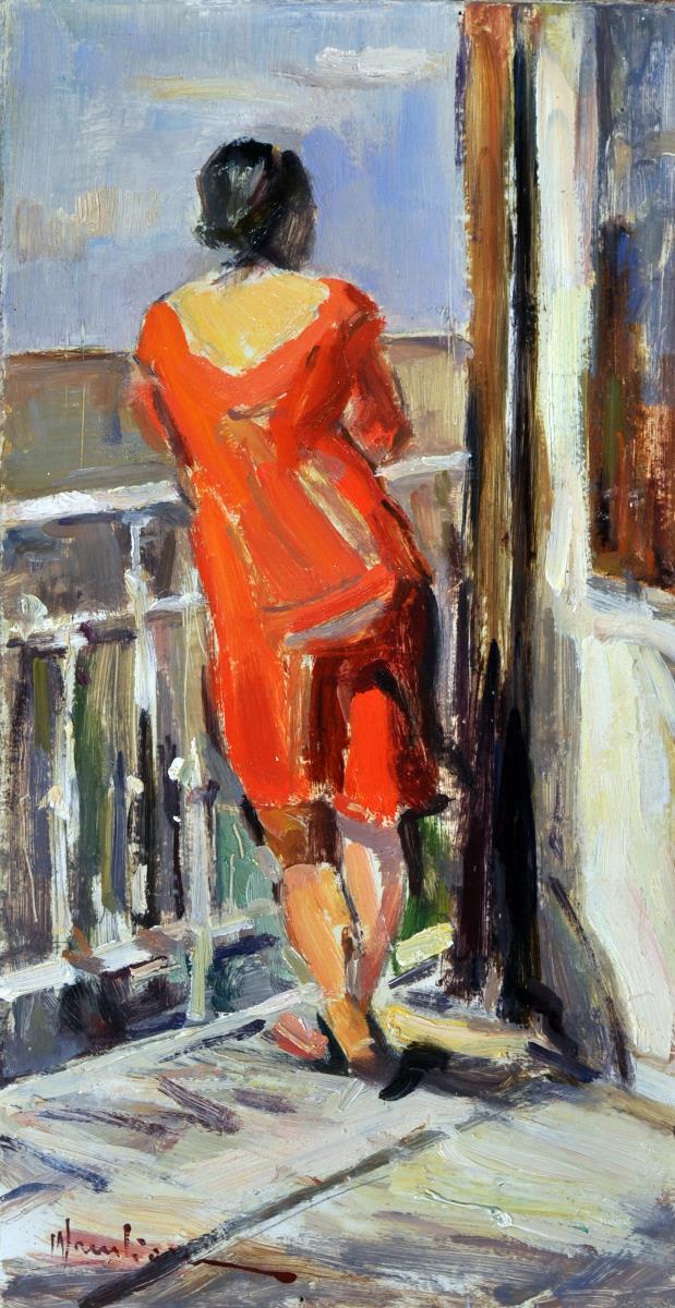 Lambiase WalterLambiase Walter (Cava dei Tirreni, SA 1925 - Napoli 2004) Sul balcone olio su tavola, cm 31x16,5 firmato in basso a sinistra: W. Lambiase